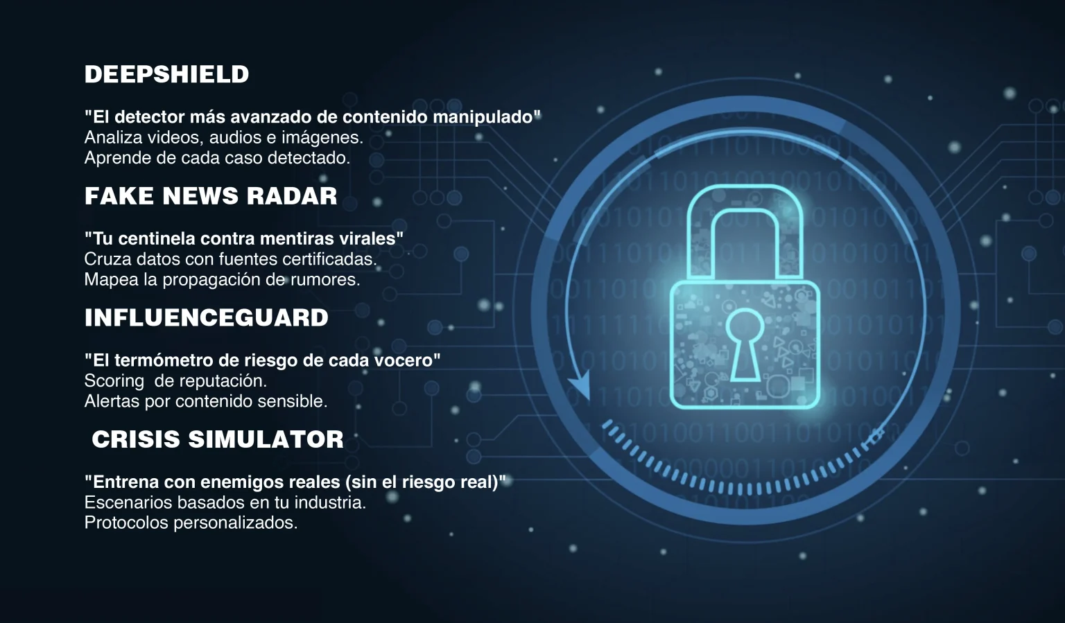 RISK-IA 2.0 + Predict - Protect ¿Tu marca está preparada para un ataque digital? Deepfakes | Fake News | Suplantación de Identidad | Influencers de Riesgo | Crisis Emergentes | Promociones apócrifas CONTACTA CON NOSOTROS TUS NUEVAS DEFENSAS ¿POR QUE FUNCIONA? ESTO ES LO QUE PIERDES SIN RISK-IA 2.0 + SIN NOSOTROS Crisis detectada a los 3 días Equipos reactivos en pánico Informes mensuales obsoletos CON NOSOTROS Detección de amenaza recurrente Metodologías integradas con IA Alertas en tiempo real con medición de riesgo NO DEJES TU REPUTACIÓN AL AZAR PROTEGE TU MARCA HOY